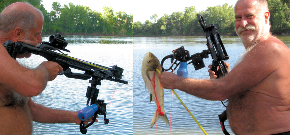 Believe it or not; I got a crossbow for my birthday and set it up for fishing.   Above I took my 1st test shot, just shooting blindly into the water.   I never saw the Asian Carp and didn't realize I'd speared a fish until I was retrieving my line.   Imagine our surpise at my blind luck.  The Asian Carp is the one that jumps into your boat, however this is the only one I've seen.