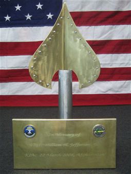"In Memory of TSgt William H. Jefferson, Jr. KIA: 22 March 2008, Afghanistan." At the dedication ceremony, the placard was presented to Colonel Cannady again to be hand-carried to Camp Jefferson and illuminated in front of the flagpole that immortalizes a fallen American hero.