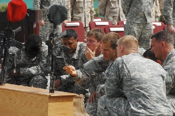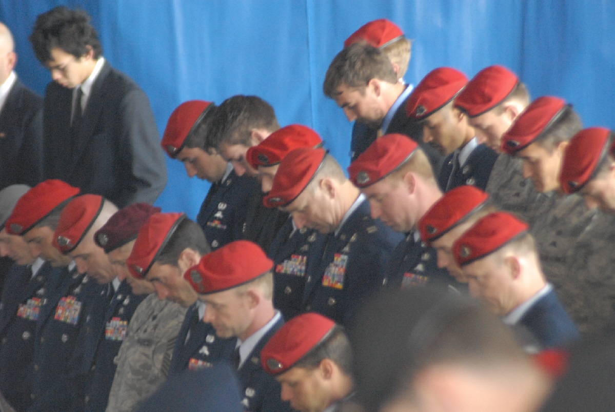 BAGRAM AIRBASE, Afghanistan-A Special Forces Team, from Fort Bragg, pays respects to two of their fallen comrades Staff Sgt. William Neil, Special Forces engineer and Tech. Sgt. William Jefferson Jr and Air Force Combat Controller. Both died in combat March 22, 2008 while conducting combat operation near Sperwan Ghar, Afghanistan.